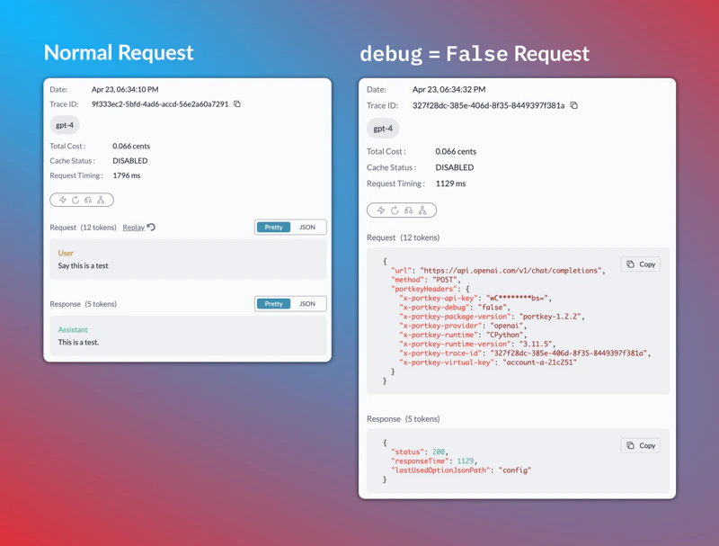 Side-by-side comparison on how a debug:false request will be logged