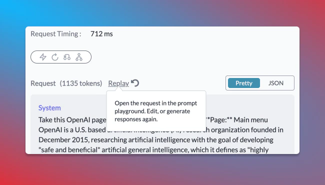 You can rerun any buggy request with just one click, straight from the log details page. The Replay button opens your request in a fresh prompt playground where you can rerun the request and edit it right there until it works.